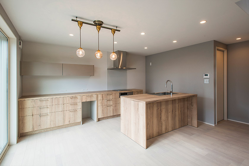 オープン階段と家具調キッチン