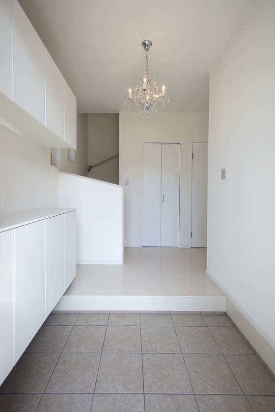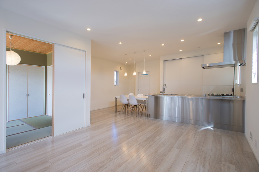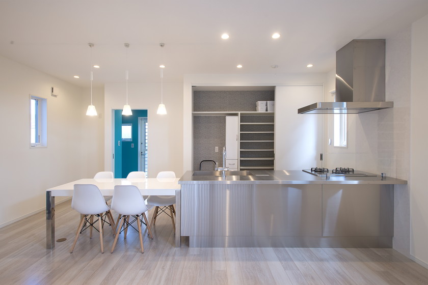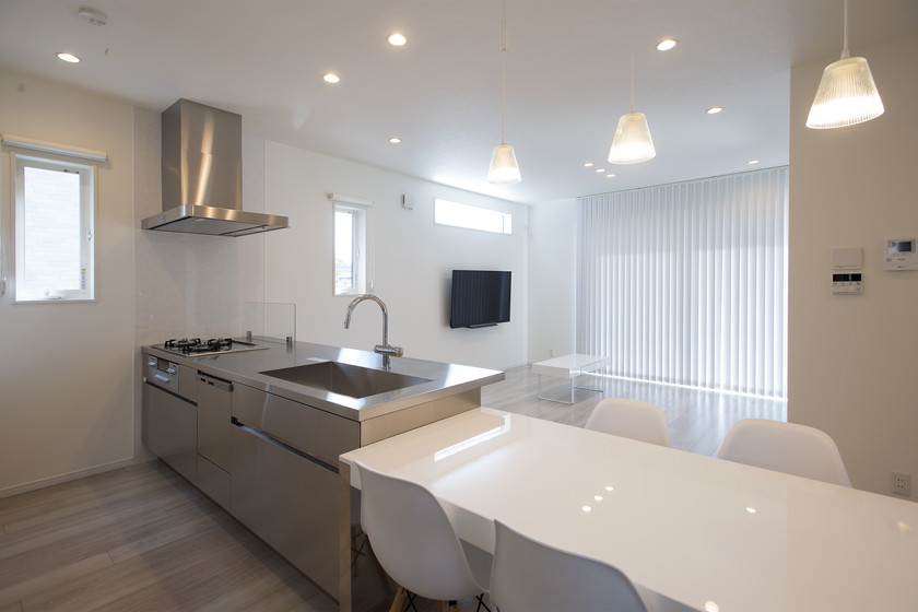 袖壁付外観 軒天:木目調 内装:白基調 ステンレスキッチン